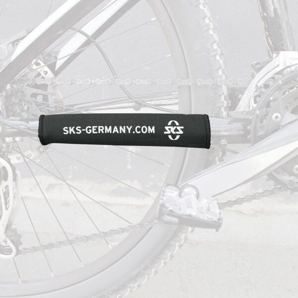 Der SKS Kettenstrebenschutz besteht aus einem besonders dehnbaren Material und wird ganz praktisch mit einem langen Klettverschluss fixiert.